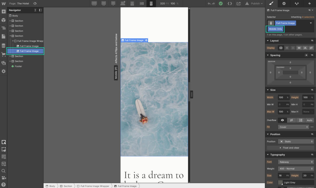With the use of these global classes you have a full control over desktop vs. mobile experience. It especially comes in handy to have the Full Frame Image element for desktop and mobile to your preference.