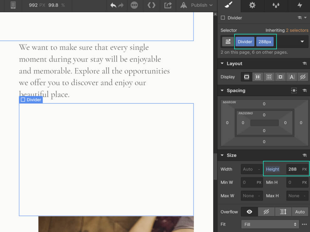 For vertical spacing Div Blocks are used instead, with a class name of 'Divider' to which a combo class is added.