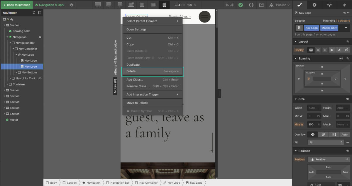 To edit the dark version of the navigation bar, simply open a page where only the dark navigation is present. An example would be 'The Hotel' Page.